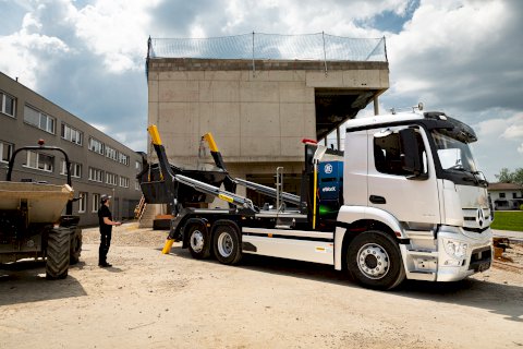 Actros z konwencjonalnym silnikiem wysokoprężnym od lat doskonale sprawdza się w transporcie budowlanym, przewożąc materiały sypkie zazwyczaj drogami, a niekiedy także w terenie. Aktualnie ten samochód ciężarowy najwyższej klasy jest dostępny również z akumulatorowym napędem elektrycznym. eActros, zaprojektowany specjalnie do ciężkiego transportu dystrybucyjnego, ma atuty, które może wykorzystywać także w wielu innych zastosowaniach – jest lokalnie neutralny pod względem emisji dwutlenku węgla i cichy podczas jazdy.