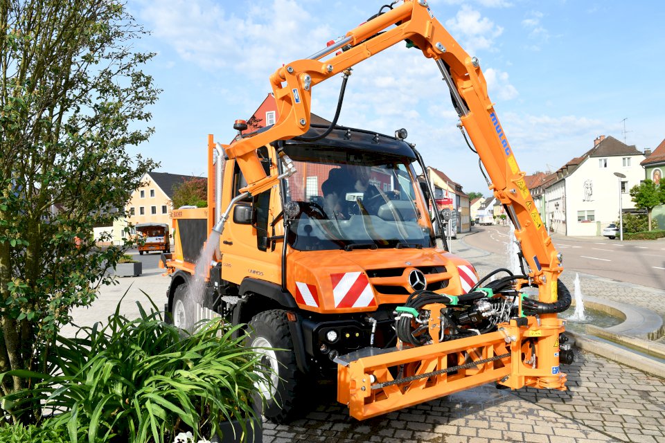 Kilka informacji o prezentowanym osprzęcie: Urządzenie z serii Yeti L firmy Buchner to automatyczna polewarka, w której solanka jest precyzyjnie rozprowadzana przez płytę rozsiewającą na szerokość do ośmiu metrów. Oprócz zimowego utrzymania dróg Yeti L nadaje się również do zastosowań letnich, takich jak podlewanie, nawadnianie i czyszczenie. Zaletą wysięgnika czołowego Mulag z podlewarką GE jest możliwość wygodnego podlewania roślin bez opuszczania pojazdu przez kierowcę przy każdej kolejnej operacji podlewania. Jest to nie tylko ekonomiczne, ale także bezpieczniejsze dla kierowcy. Do wysięgnika czołowego Mulag zamiast głowicy podlewarki można podłączyć również szereg innych narzędzi, np głowicę koszącą lub szczotkę do usuwania chwastów.